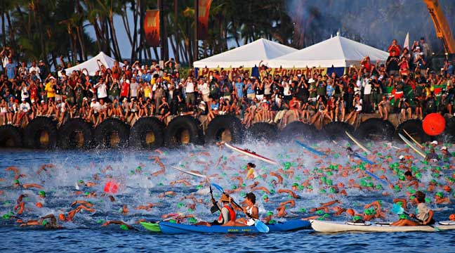 Early morning start of Ironman race from Kailua Pier.