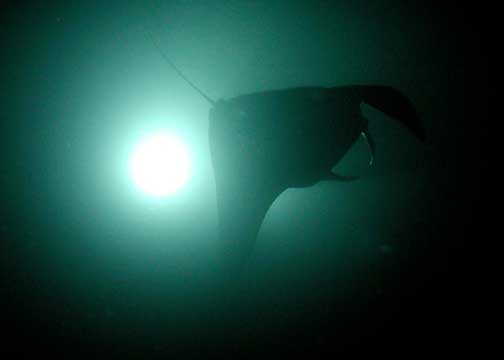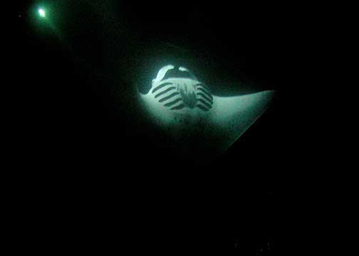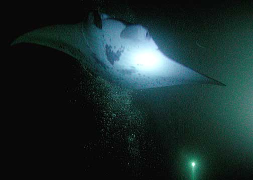 Manta ray back lit by video camera light.