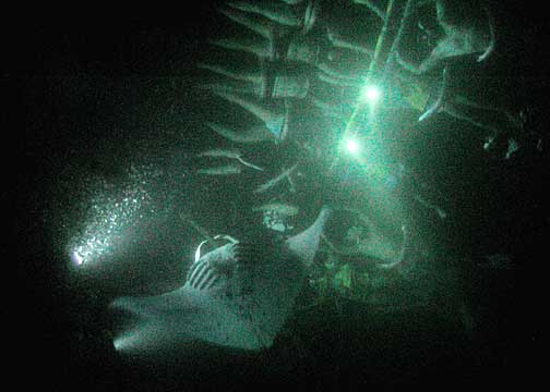 My first night dive was a manta ray dive.  There were two - one with an 8' wing span and the other with a 12' span. Lights are used to attract the plankton which, in turn, attracts the manta rays.